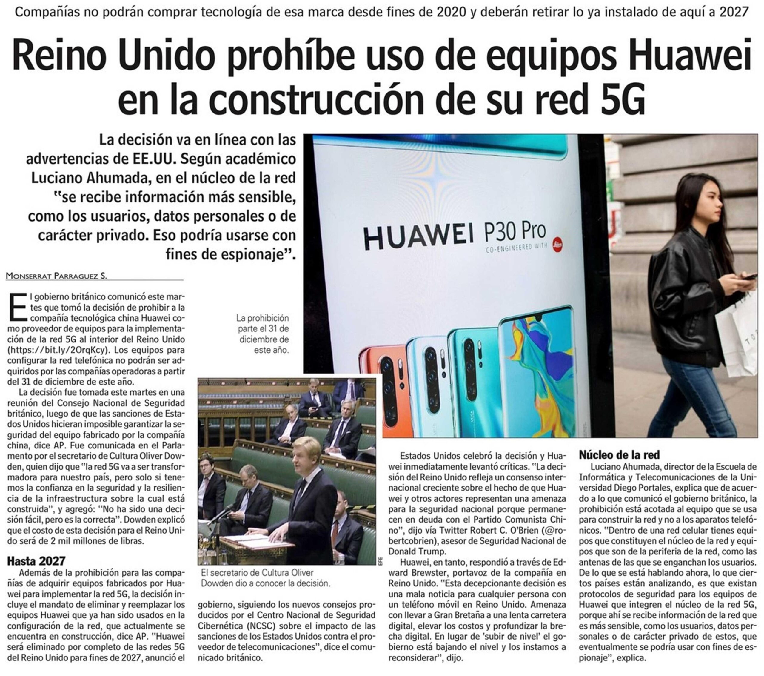 Reino Unido prohibe uso de equipos Huawel en la construcción de su red 5G